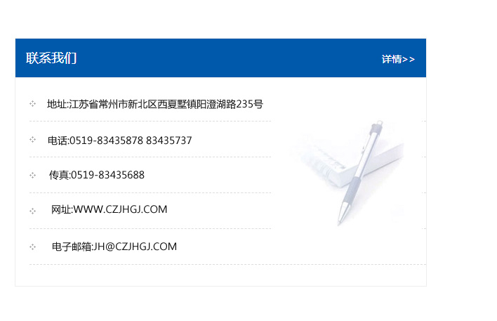 地址:常州市新北區友邦商務大廈1幢16、17層  電話:0519-85101652  傳真:0519-85112595  郵編:213022  網址:www_cz-jiayue_cn.zonoon.com  郵箱:xiajifengaa@163.com